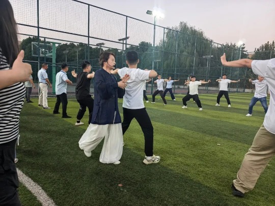“双手托天理三焦,左右开弓似射雕……”伴随舒缓的民乐,傅老师先带领大家领略八段锦千年文化的精髓,随后分段示范、逐式纠正,手把手指导呼吸节奏与筋骨牵拉。参训员工或抬臂沉跨,或旋腰回首,一招一式尽显专注,汗水与欢笑交织。